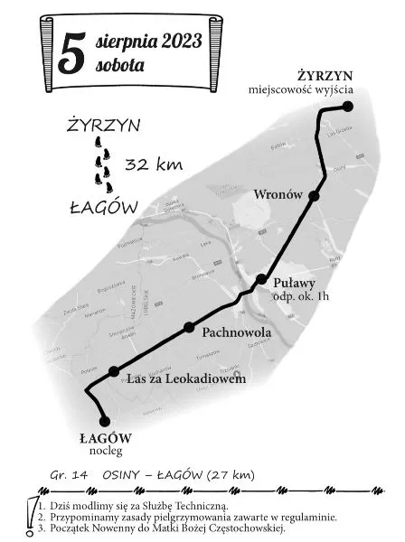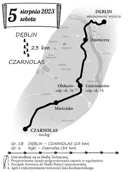 Dziś Pielgrzymi kolumny siedleckiej mają do pokonania odcinek około 23 km z Dęblina do Czarnolasu, Pielgrzymi kolumny bialskiej mają do przejścia około 32 km z Żyrzyna do Łagowa. Na trasie są już wszystkie grupy Pieszej Pielgrzymki Podlaskiej na Jasną Górę. Zapoznajmy się z konferencjami i rozmyślaniami, które będą towarzyszyć Pielgrzymom na trasie.
