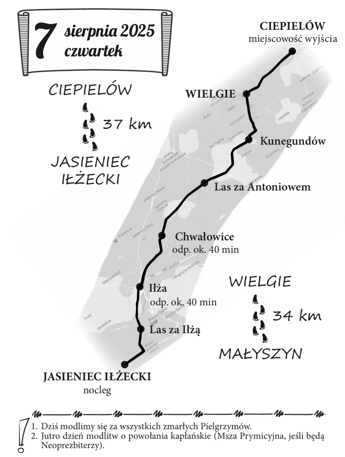 Pielgrzymki kolumny siedleckiej pokonują trasę z z Ciepielowa do Jasieńca Iłżeckiego o długości około 37 km.