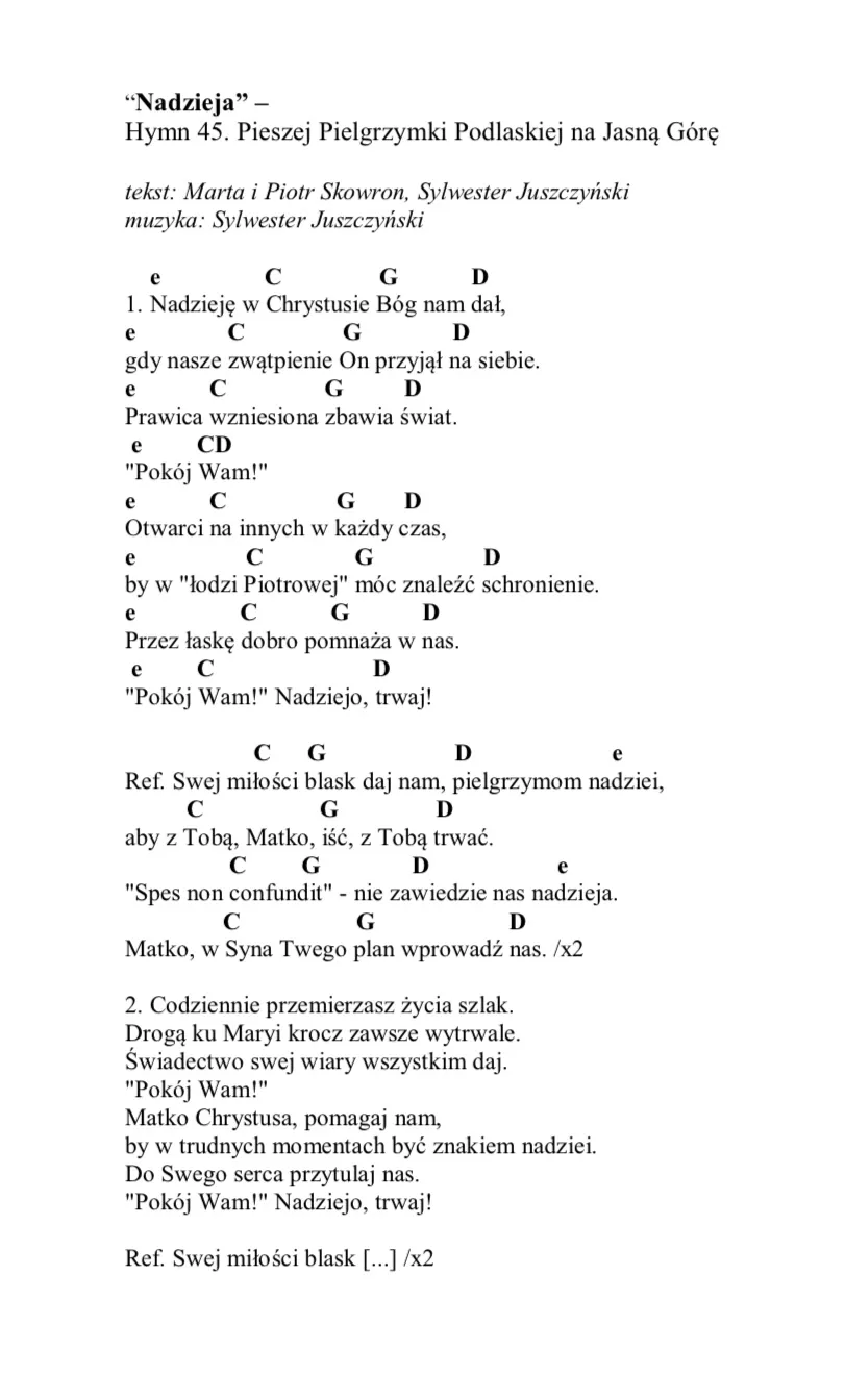 Hymn 45. Pieszej Pielgrzymki Podlaskiej na Jasną Górę, który premierę miał w dniu 11 lipca podczas audycji pielgrzymkowej na antenie Katolickiego Radio Podlasie.